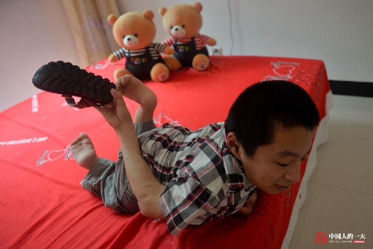 身体的残疾给他的生活带来很多不便,他们的床虽然较一般人家的床矮了不少,但董志军上床还是需要“连滚带爬”。穿鞋这样简单的问题,他要趴在床上从身后才能穿上。