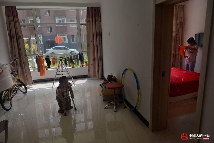 身高只有80厘米的董志军人小志坚,自己贷款在当地县城购买了一套住房,每月还供900多元。家里装修简单,基本没有什么家具,客厅显得空荡荡。但是他们的房间干净整洁,红色的床上用品衬托出二人世界的温馨。