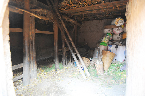 凉山州美姑县拉木阿觉乡马依村一住处,左边睡牛马,右边住着一家人。新华社记者陈地摄。