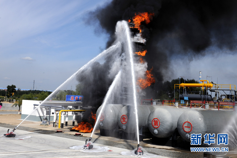 8月23日,第二届全国危险化学品救援技术竞赛在黑龙江省大庆市中石油大庆油田公司正式拉开帷幕。开幕式上综合演练,消防机器人对事故现场进行灭火作业。