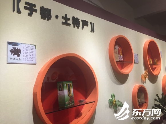图片说明:孵化园内展示了于都各类土特产,包含脐橙、烧卷子等。