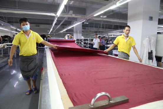 在赢家服饰的现代化制造基地,职工林芳正在检查面料的优劣,她说,来到这里工作已经三年了,负责检查面料色差及有无破损这一环节,每个月能够得到3000元左右的收入。