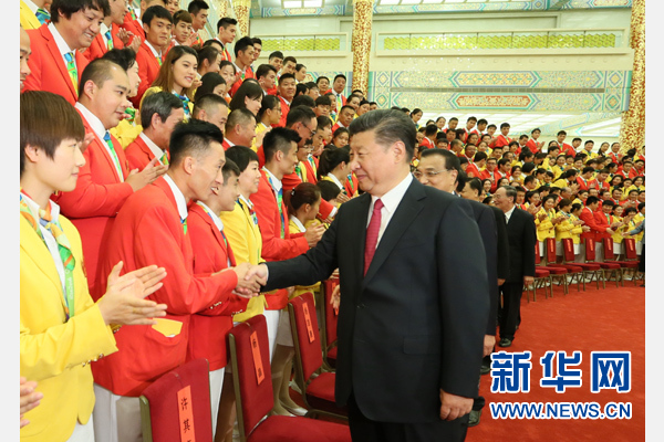 习近平强调,我们讲道路自信、理论自信、制度自信、文化自信。我们不以胜负论英雄,同时英雄就要敢于争先、敢于争第一。在奥运会这样高水平的竞争场合,争第一、拿金牌奖牌很不容易,拿到金牌奖牌的,值得尊敬和表扬。同时,只要勇于战胜自我、超越自我,即使没有拿到金牌奖牌,同样值得尊敬和表扬。所以我要说,这次拿了金牌奖牌的队伍和运动员,都是好样的。这次没拿到金牌奖牌,但在比赛中做了最好的自己的队伍和运动员,也都是好样的。中国女排不畏强手、英勇顽强,打出了风格、打出了水平,时隔12年再夺奥运金牌,充分展现了女排精神,全国人民都很振奋。我国体育健儿在里约奥运会上的表现,展示了强大正能量,展示了“人生能有几回搏”的奋斗精神。实现“两个一百年”奋斗目标、实现中华民族伟大复兴的中国梦,就需要这样的精神。要在全社会广泛宣传我国体育健儿在奥运会赛场上展现的拼搏精神,使之化为全党全国各族人民团结奋斗的强大精神力量。