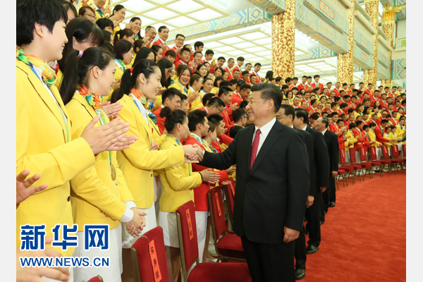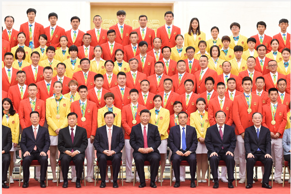 在热烈的掌声中,习近平发表了热情洋溢的讲话。他表示,在刚刚结束的里约奥运会上,你们顽强拼搏、奋勇争先,出色完成了各项参赛任务,取得了26枚金牌、18枚银牌、26枚铜牌的优异成绩,位居金牌、奖牌榜前列,实现了运动成绩和精神文明双丰收,续写了中国体育新辉煌。