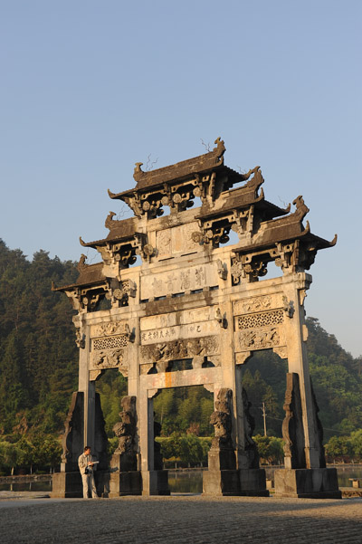 牌楼建于明万历年间,为三间四柱五楼建筑格式,选用优质的黟县青石建造。