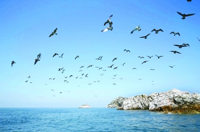 8月24日,江苏省连云港市最东端的车牛山岛风光潋艳,群鸥齐飞。车牛山岛位于黄海海州湾内,总面积仅有0.06平方公里,距离陆地20多海里。车牛山岛位于北纬35度线,水温四季分明,水下能见度大于15米,是鱼类和鸟类栖息繁衍的良好场所。王健民摄/光明图片
