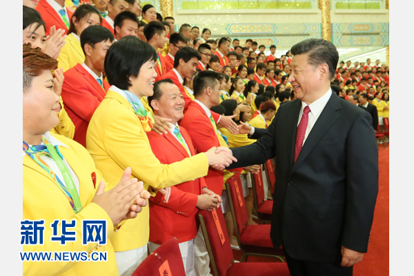 习近平强调,我们讲道路自信、理论自信、制度自信、文化自信。我们不以胜负论英雄,同时英雄就要敢于争先、敢于争第一。在奥运会这样高水平的竞争场合,争第一、拿金牌奖牌很不容易,拿到金牌奖牌的,值得尊敬和表扬。同时,只要勇于战胜自我、超越自我,即使没有拿到金牌奖牌,同样值得尊敬和表扬。所以我要说,这次拿了金牌奖牌的队伍和运动员,都是好样的。这次没拿到金牌奖牌,但在比赛中做了最好的自己的队伍和运动员,也都是好样的。中国女排不畏强手、英勇顽强,打出了风格、打出了水平,时隔12年再夺奥运金牌,充分展现了女排精神,全国人民都很振奋。我国体育健儿在里约奥运会上的表现,展示了强大正能量,展示了“人生能有几回搏”的奋斗精神。实现“两个一百年”奋斗目标、实现中华民族伟大复兴的中国梦,就需要这样的精神。要在全社会广泛宣传我国体育健儿在奥运会赛场上展现的拼搏精神,使之化为全党全国各族人民团结奋斗的强大精神力量。