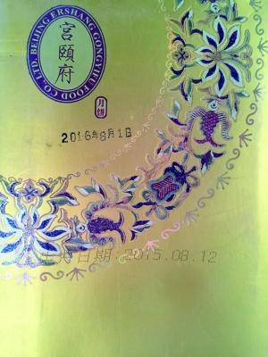 调查中,记者发现,宫颐府月饼礼盒“双生产日期”的问题并非仅出现在乐天玛特超市。叶先生日前在永辉超市鲁谷店购买的宫颐府溢香月饼也出现了上述情况,每盒售价218元。在标明的2016年8月1日的生产日期下方,隐约可见“2015年8月”的印迹。
