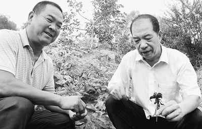 刘满堂(右)和村民在查看油用牡丹的结籽状况。张丹华摄