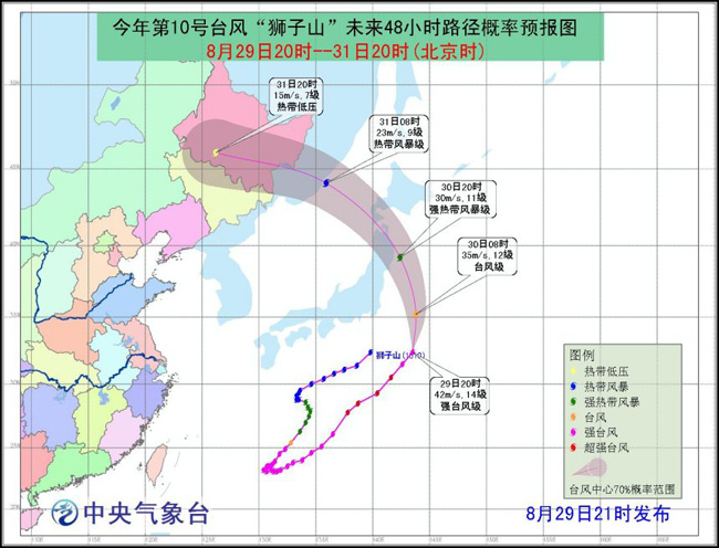 预计,“狮子山”将以每小时25-30公里的速度向偏北方向移动,强度将逐渐减弱,并将以强热带风暴级或台风级在30日傍晚前后登陆日本本州东北部一带沿海(25~33米/秒,10~12级)。之后,“狮子山”将穿越日本本州岛,移入日本海,并继续向西北转偏西方向移动,移速逐渐加快,强度继续减弱。31日白天,“狮子山”将以热带低压级或热带风暴级进入我国东北地区(16~20米/秒,7~8级),并与温带气旋相互作用,逐渐减弱消亡并融入温带气旋中。
