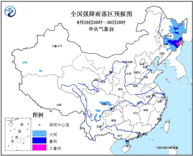 在降雨方面,黑龙江中东部、吉林和辽宁大部、内蒙古东部有大雨,黑龙江东部、吉林东部、辽宁东北部的部分地区有暴雨、局地大暴雨,过程累计雨量为30~60毫米,东北东部的部分地区可达80~120毫米,局地点雨量150~200毫米。强风雨主要影响时段是8月29日夜间至9月1日。