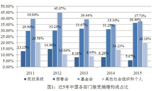 上述报告称,2015年民政系统捐赠比例为5.67%,慈善会和基金会捐赠比例分别为36.49%和37.73%,而其他组织和个人捐赠,自2013年低点后在近两年开始回升,占比达到20.16%,已超过民政系统接收占比。