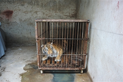 一只老虎被关在狭小的铁笼中,几乎没有活动空间。亚洲善待动物组织供图