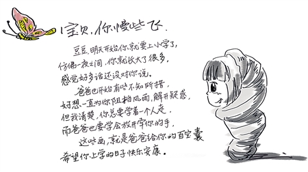 “豆豆,明天你就要上学了,感觉很多话没对你说,好想一直为你阻挡风雨,但你总要学着一个人走。”昨日,一组活泼俏皮的漫画在微博热传,漫画的作者称,这些画是给女儿的“百宝囊”,希望女儿豆豆上学的日子快乐安康。