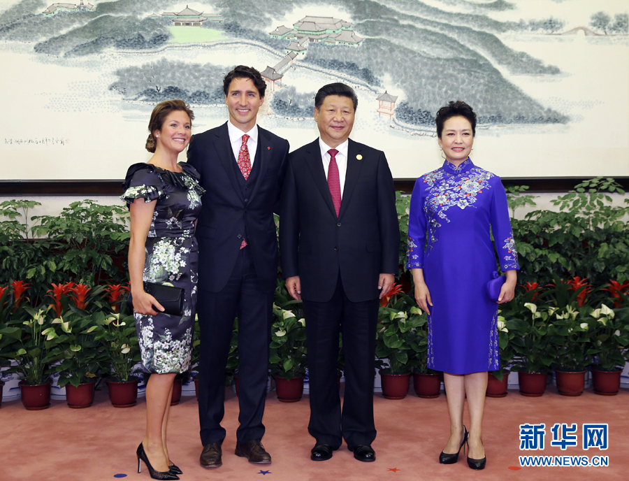 9月4日,国家主席习近平和夫人彭丽媛在杭州西子宾馆举行宴会,欢迎出席二十国集团领导人杭州峰会的外方代表团团长及所有嘉宾。这是习近平和彭丽媛迎候加拿大总理特鲁多夫妇。 新华社记者丁林摄