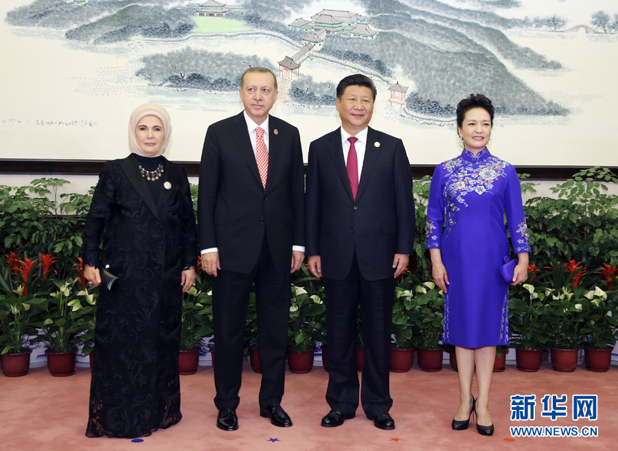 9月4日,国家主席习近平和夫人彭丽媛在杭州西子宾馆举行宴会,欢迎出席二十国集团领导人杭州峰会的外方代表团团长及所有嘉宾。这是习近平和彭丽媛迎候土耳其总统埃尔多安夫妇。 新华社记者丁林摄