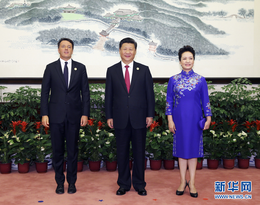 9月4日,国家主席习近平和夫人彭丽媛在杭州西子宾馆举行宴会,欢迎出席二十国集团领导人杭州峰会的外方代表团团长及所有嘉宾。这是习近平和彭丽媛迎候意大利总理伦齐。 新华社记者丁林摄