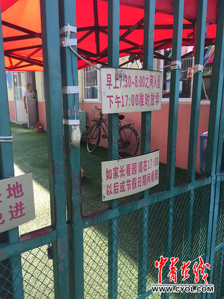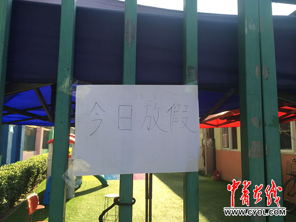 今天7时许,中国青年报·中青在线记者来到这家幼儿园时,紧闭的大门上正用透明胶贴着一张白纸,上面手写着四个字——“今日放假”。