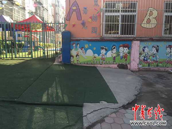 这家幼儿园紧挨着旁边一栋居民楼,布局很简单,一共两个长条,右边是一排用彩钢板搭成的平房,左侧大约5米多宽的空地被布置成塑胶跑道,作为孩子们的活动场地。