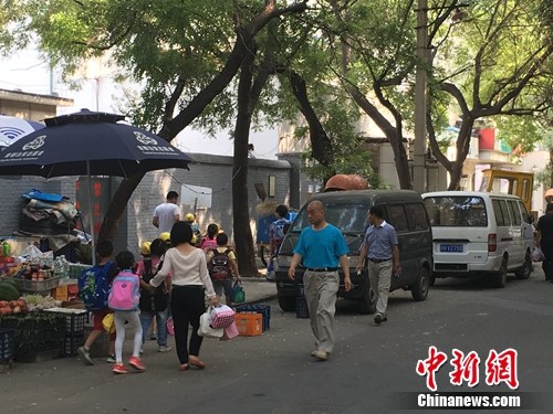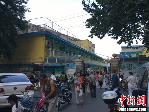 北京某幼儿园门口,家长接孩子放学。汤琪 摄
