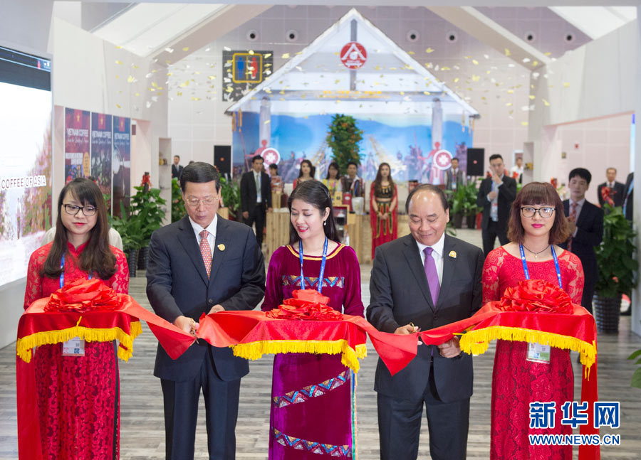 9月11日,第十三届中国—东盟博览会和中国—东盟商务与投资峰会在广西南宁开幕。中共中央政治局常委、国务院副总理张高丽出席开幕式并发表主旨演讲。这是开幕式后,张高丽与越南总理阮春福共同出席越南馆开馆仪式。新华社记者 王晔 摄