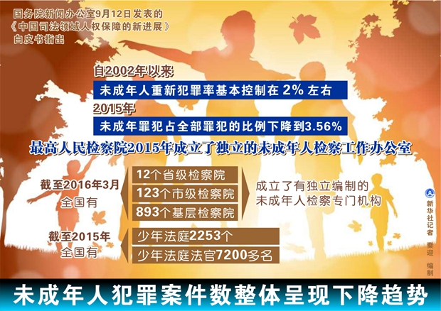新华社北京9月12日电(记者黄小希、程卓)国务院新闻办公室12日发表的《中国司法领域人权保障的新进展》白皮书指出,自2002年以来,未成年人重新犯罪率基本控制在2%左右,未成年人犯罪案件数整体呈现下降趋势,未成年罪犯占全部罪犯的比例逐渐下降,2015年下降到3.56%。
