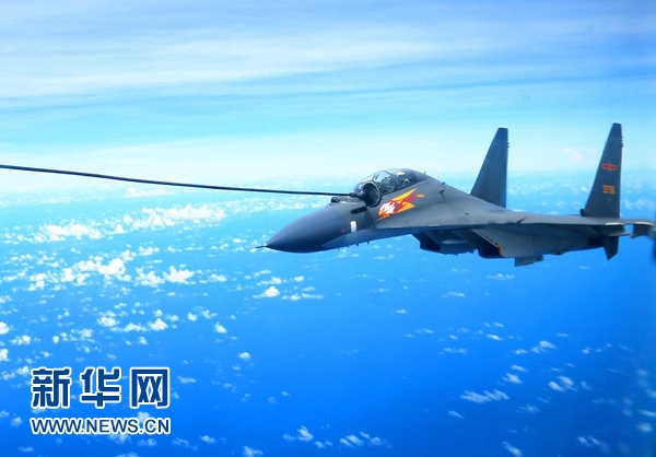 9月12日,空军苏-30飞机海上空中受油。当日,空军新闻发言人申进科表示,空军于当日组织轰炸机、歼击机、预警机、加油机等多型战机,飞经巴士海峡赴西太平洋进行远海训练。新华社发(肖建军 摄)