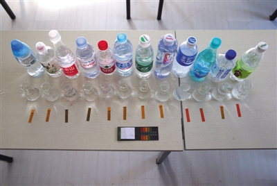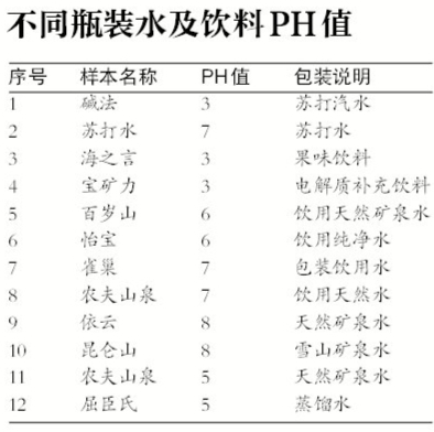 实验人员介绍,根据数据,同为矿泉水,但PH值及酸碱度却不同。例如,有些矿泉水为碱性,有些却呈弱酸性。饮用水的PH值则大多为中性,为6或7。此外,由于一些饮料中加入酸性物质,因此,PH值为3,酸性较强。