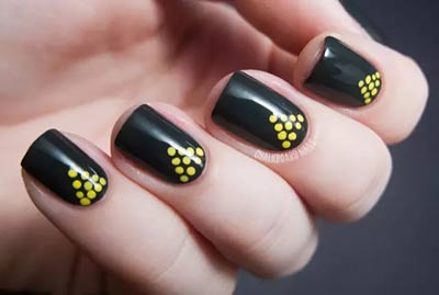 ▼将创可贴剪小,将有气孔的那块单独撕下。涂好指甲底色并等它完全干透,然后贴上创可贴,将圆点的颜色涂在表面上即可。