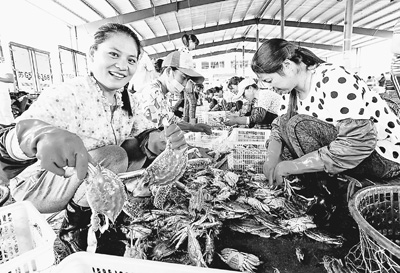 9月12日,江苏连云港市赣榆区海头港海产品交易市场工作人员展示捕获的鲜活梭子蟹。近日,连云港市秋捕梭子蟹喜获丰收,梭子蟹日到港量40多万公斤,当地沿海渔民加紧捕捞和分拣,及时装车外运,满足中秋、国庆节日市场需求。