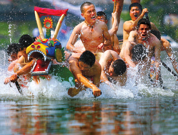 在洪氏宗祠门前是一个由多艘木船托起的水上舞台,船拳、滚灯、五常十八般武艺、水上越剧等传统节目呈现其上,极具地方特色。每到端午,深潭口、五常河道两岸人声鼎沸,热闹非凡,一年一度的龙舟胜会在此上演。如今,“五常龙舟胜会”已是国家级非物质文化遗产。