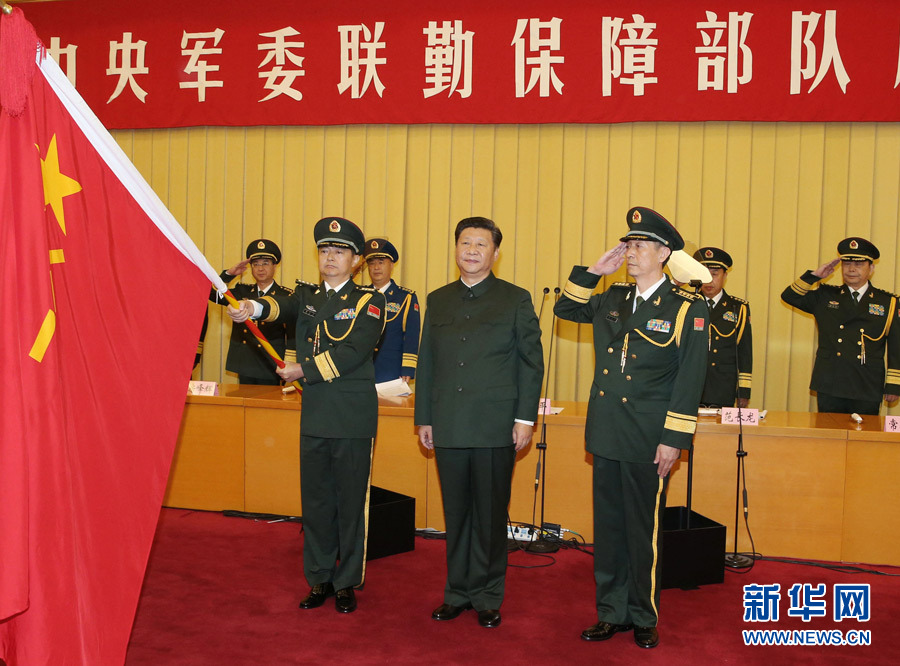9月13日,中央军委联勤保障部队成立大会在北京八一大楼隆重举行。中共中央总书记、国家主席、中央军委主席习近平向武汉联勤保障基地和无锡、桂林、西宁、沈阳、郑州联勤保障中心授予军旗并致训词。这是习近平向无锡联勤保障中心主任、政治委员授军旗。新华社记者李刚摄