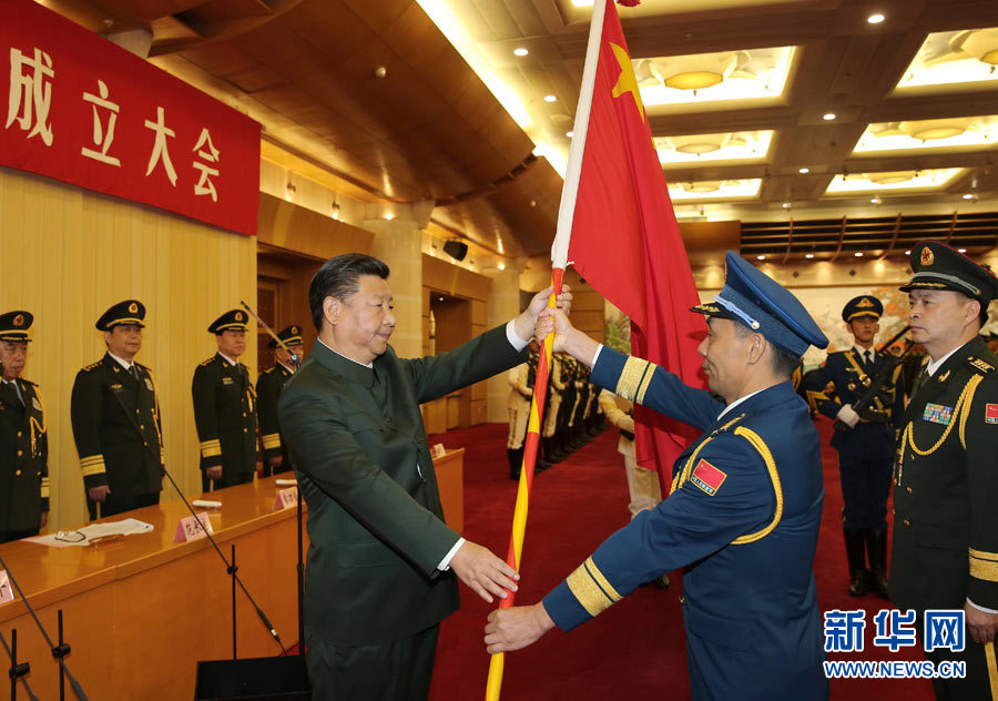 9月13日,中央军委联勤保障部队成立大会在北京八一大楼隆重举行。中共中央总书记、国家主席、中央军委主席习近平向武汉联勤保障基地和无锡、桂林、西宁、沈阳、郑州联勤保障中心授予军旗并致训词。这是习近平向郑州联勤保障中心主任、政治委员授军旗。新华社记者李刚摄