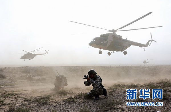 在“火力-2015·青铜峡”实兵对抗演习中,陆军第21集团军钢铁红军师蓝军穿插分队采取机降攻击的方法直插敌后,对“敌”炮兵阵地进行精确打击(2015年8月11日摄)。