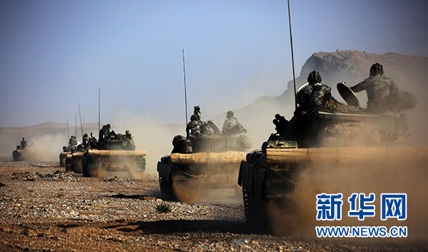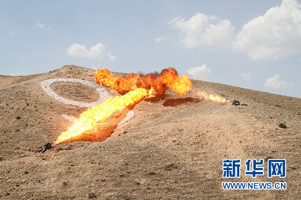 陆军第21集团军钢铁红军师在担负原兰州军区战法创新演练任务中,用火力摧毁“敌”碉堡(2013年8月4日摄)。