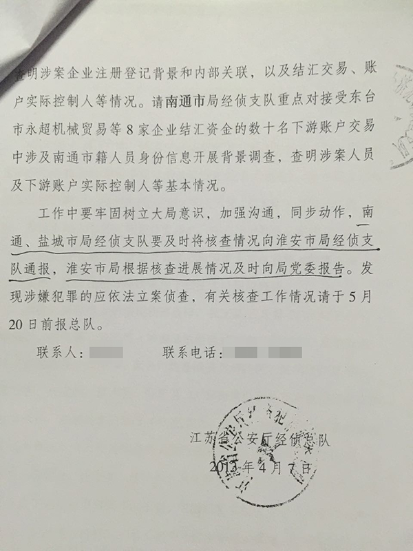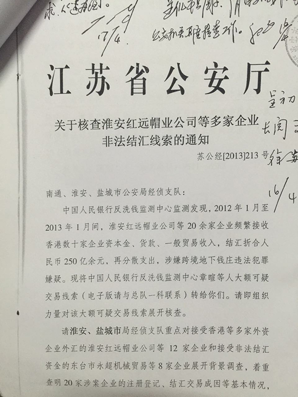 2013年4月7日,江苏省公安厅下达的《关于核查淮安红远帽业公司等多家企业非法结汇线索的通知》。“相当亮眼”的外资数据