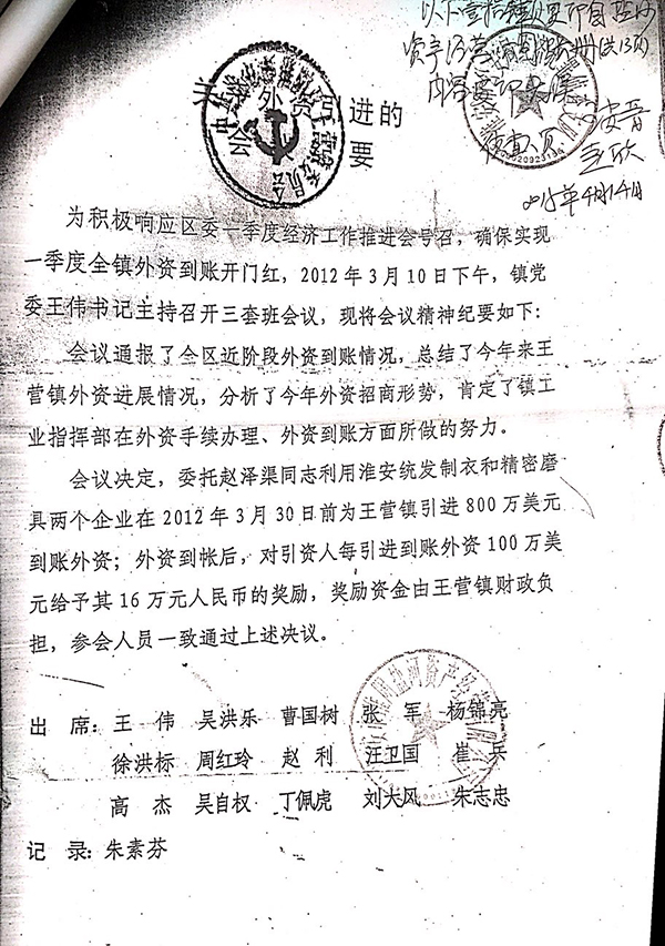 王营镇关于外资引进的会议纪要。花钱“买外资”积弊已久