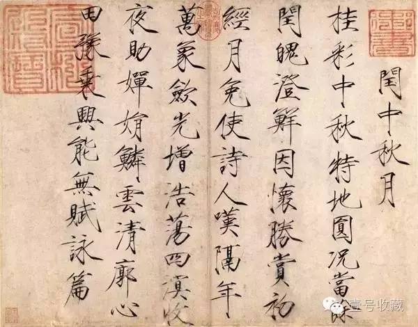 宋徽宗赵佶有一幅“瘦金体”的《闰中秋月帖》,是一首七言律诗:“桂彩中秋特地圆,况当余闰魄澄鲜。因怀胜赏初经月,免使诗人叹隔年。万象敛光增浩荡,四溟收月助婵娟。鳞云清廓心田豫,乘兴能无赋咏篇。”