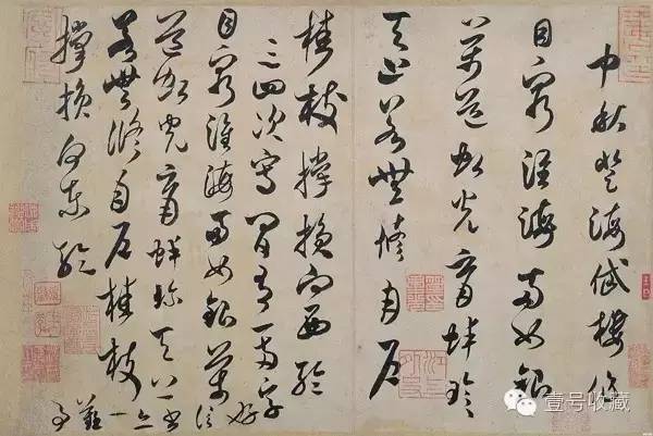米芾《中秋登海岱楼作诗帖》(简称《中秋诗帖》)收藏于日本大阪市立美术馆。诗中写道:“目穷淮海两如银,万道虹光育蚌珍,天上若无修月户,桂枝撑损向西轮。目穷淮海两如银,万道虹光育蚌珍,天上若无修月户,桂枝撑损向东轮。”