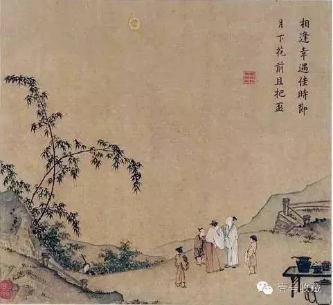 《月下把杯图》所绘的是十五中秋美景之夜,一轮圆月高挂空中,照得天地是那么的明亮。在这“每逢佳节倍思亲”的美景月下,恰逢远方多年不见的好友佳节来访,这让刚刚还在睹物思友的主人家中,立即增添了极大的精神欢乐。