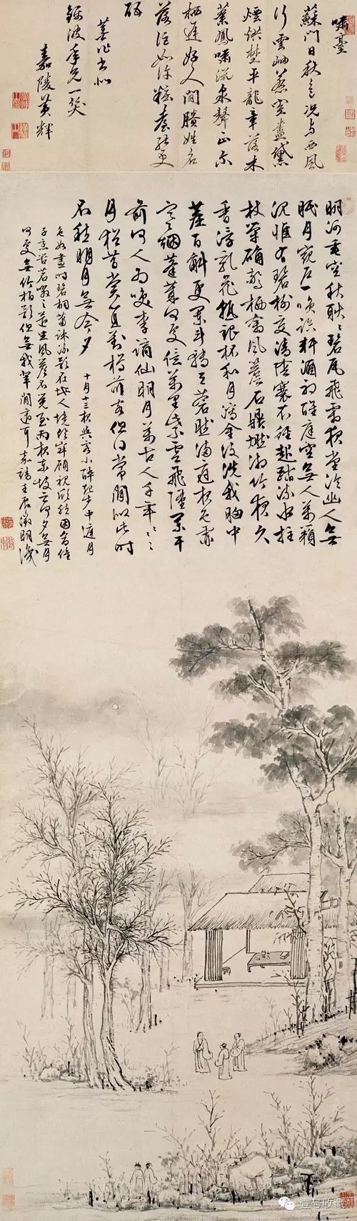 沈周是明代最重要的文人画家之一,他和文徵明、唐寅、仇英四人,近世并称为“吴门四家”,《有竹庄中秋赏月图》整卷由画面与书法两部分组成,画面高34厘米,长 135.5厘米,书法部分高34.5厘米,长895厘米,高头大卷,可称沈周书画作品中的煌煌巨著。