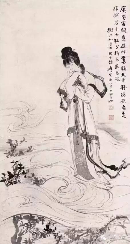 张大千1933年创作《嫦娥奔月》,月桂树下的嫦娥怀抱玉兔,画中人物造型温婉娴静,面部丰盈,举止安祥。人物的面相细目小口,体态婀娜,发髻的钩皴率意虚和,颇有质感,衣纹的行笔十分自由流畅。有张大千早期仕女人物画的风采。