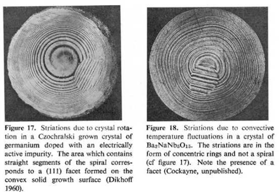 更不可思议的是,当温差超过临界条件时,这种热毛细流动还会进入一种振荡流的状态,可以表现为温度的振荡。想想晶体在生长的过程中,忽冷忽热的,不出现条纹才怪。