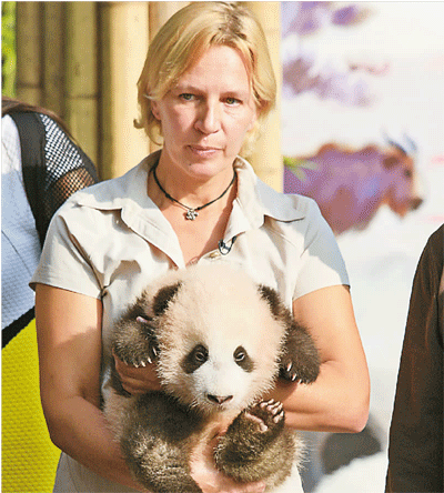 9月15日是中秋节,也是比利时天堂动物园的大熊猫宝宝出生百日。经过网络征集,今天,熊猫宝宝被正式命名为“天宝”,寓意熊猫宝宝是上天赐予天堂动物园的珍宝。图为动物园饲养员抱“天宝”与游人见面。 本报驻布鲁塞尔记者 刘军摄/光明图片