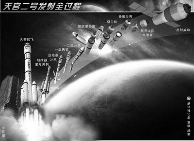 荆木春说,第155秒,火箭四个助推器燃料耗尽,与火箭主体脱离。第160秒,一级火箭燃料耗尽,一二级火箭分离,火箭二级发动机启动。第210秒,二级火箭带着天宫飞出大气层,保护航天器的顶部整流罩也结束了自己的使命,同样要被火箭抛掉。第582秒,火箭二级发动机在燃料用尽后停止工作。3秒后船箭分离,火箭将天宫二号送到预定轨道,火箭的使命至此结束。