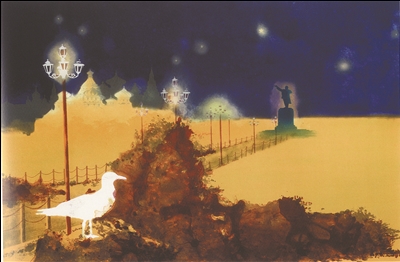 图为《星路远方》(李康 作),作品采用套色版画丝网技法,题材源于画家访问俄罗斯时,有感于“一带一路”的历史回望和新时代下伟大复兴的构想。冷暖色彩的强烈对比,昭示着星路下远方的希望与辉煌。(缇妮)