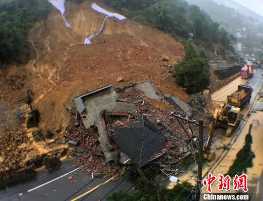 台风携风雨而来,永嘉县桥头镇因强降水还发生了山体滑坡次生灾害。9月15日上午10点50分左右,永嘉县S333省道桥头镇闹水坑村段发生山体滑坡,滑坡点附近一栋在建的3间4层楼房倒塌,省道交通中断。