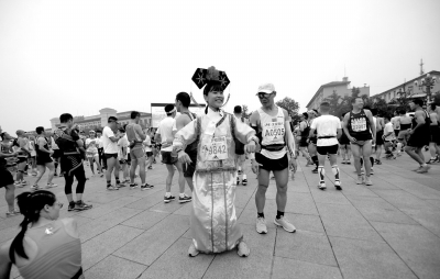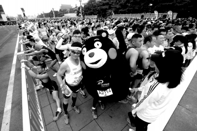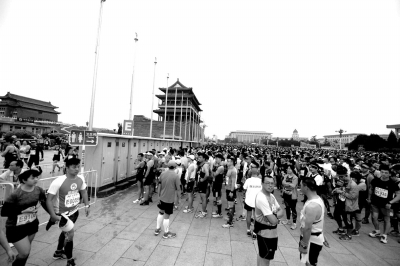 昨天早上5点半,距离开赛还有两小时,天安门广场上早已挤满了前来参赛的选手,他们装备齐整,活力满满,集体做起热身运动。一只憨态可掬的“熊本”挤进人群,引起一阵尖叫,选手纷纷上前与他合影留念。尽管主办方对选手着装有所限制,仍有人“大开脑洞”,在一众“运动Style”中显得格外瞩目:全身皇帝行头的小伙不紧不慢地在打开“马到成功”的扇面、顶着头饰穿旗袍的美女格格笑靥如花,还有人仿佛坠入人间的天使,背着一对天使的翅膀,仿佛随时准备“起飞”……