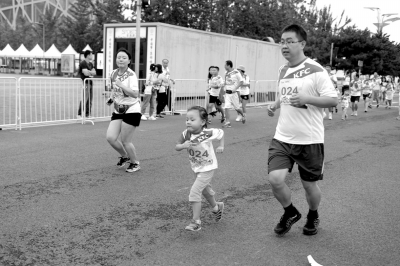 在马拉松终点的赛场外,许多家长带着小朋友绕水立方一周进行亲子跑,最小的孩子躺在婴儿车内,家长边推车边跑,场面十分有爱。据了解,共550组家庭参与了全长两公里的迷你马拉松,其中40组是“小候鸟跑团”,即打工子弟家庭。这些家庭与赛场内的选手共享跑步的乐趣。