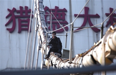 2013年3月12日,广州,曹再发爬上猎德大桥桥索约10层楼高的位置,扬言跳桥。图/视觉中国